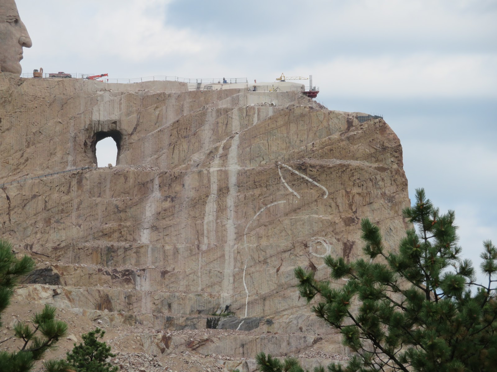 We made it to our first tourist attraction of the day, Crazy Horse Memorial. This is a privately owned monument. Korczak Ziolkowski was a sculptor who helped to carve Mt. Rushmore. Chief Henry Standing Bear asked him to make a monument to the brave men of the Native American nations. They wanted Crazy Horse to be the object in the sculpture and they had a mountain picked out. Ziolkowski agreed to do that. He moved there, married, raised a family of lots of children who continue his work to this day. The end plan is not only the monument but the continuing University and eventually a medical center. Ziolkowski has actually turned down millions in federal money as he doesn't feel the government will follow through with the mission first envisioned.