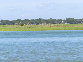 The salt marsh 'no wake' zone. This makes this area a little slower pace and relaxing. Lots of water fowl to see. We also saw a white building with a mound of something in front. I guessed right when I told Claude it was an oyster shell factory of some kind. Oysters are critical to keeping the water healthy in the low country area. The people recycle their oyster shells. The mound was a huge mound of oyster shells being returned to the water. They will eventually have new oysters growing in them over the years. These will take toxins out of the water and provide fresh water and air for the communities in this area. We also saw a man very relaxed and fishing in the salt water marsh. I do love these areas along the shores.