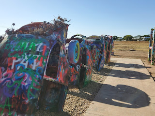 And in practically some time, we were in Amarillo, Texas. We made a beeline for Slug Bug Ranch! That's right, Volkswagen Beetles planted in the ground. I only expected Volkswagens. There are other large cars and some grain elevators. Note on some of the big car, the use of cow horns on the front fenders. You are welcome to bring paint and add your artwork to what us currently there. Fun. Oh, the last picture is Where's Claudo?